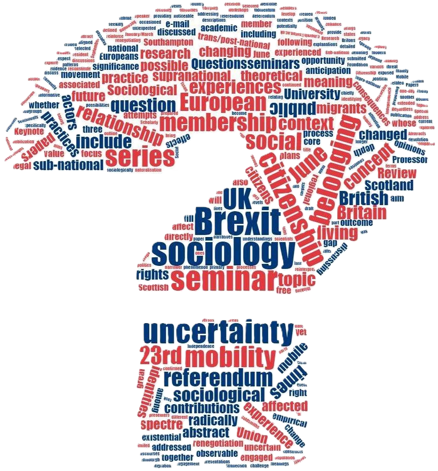 It was in order to pursue such inquiries that the Sociological Review-funded project ‘The sociology of “Brexit”: citizenship, belonging and mobility in the context of the British referendum on EU membership’ was launched in February 2016. Having recognised EU citizens living in the UK and UK citizens living in another EU country as the social groups most directly exposed to the consequences of the UK Government’s renegotiation of the country’s terms of EU membership and the Referendum, the project consisting of a series of three public seminars set itself the double aim to identify and bring together findings from empirical research on the experiences of such ‘mobile citizens’, and to explore the theoretical possibilities of a ‘sociology of Brexit’. ‘Brexit’ – this unlikely neologism whose popularity should not have outlived the expected lifespan of any other linguistic fad of the social media age – was to be treated as a broader politico-economic process upsetting the rules by which access to social goods and services are distributed, and a discursive phenomenon affecting social perceptions and relationships; as such it provides a useful basis for analyses concerning uncertainty and social change, concepts that have been placed centre stage in contemporary sociology.