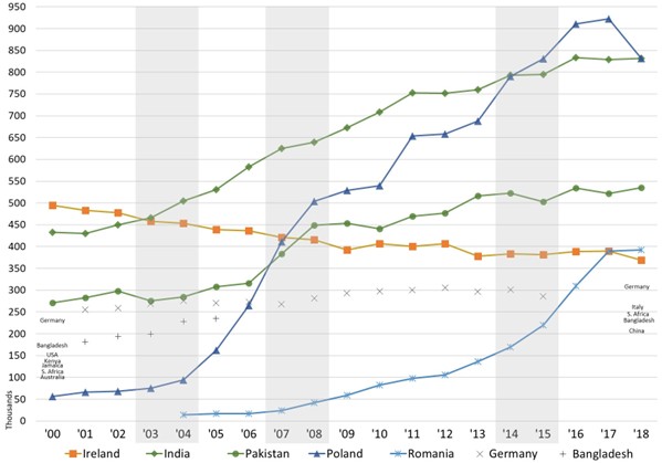 Today’s migration landscape is significantly, although not unrecognisably, different to the one painted from the palette of the Windrush generation. It covers a much larger canvas of 9.3 million foreign-born and 6.1 million foreign-citizen residents, making up 14% and 6% of the total population respectively. At the end of 2018 the top five foreign citizenships held were Polish, Romanian, Indian, Irish and Italian. The five largest non-UK countries of birth: Poland, India, Pakistan, Romania and Ireland. It is particularly the recent diversification of countries of birth which shows the strongest sign of a restructuring migration system. As charted in Figure 1, by tracing back the development of the five largest birth-country groups over two decades we can spot three major turning points. In 2014–2015 for the first time an EU member state – Poland – became the largest non-UK country of birth, overtaking the number of Indian-born despite the latter’s also increasing number. Seven years earlier, in 2007–2008, Poland had jumped to the second place, having overtaken in the course of only three years all other major established foreign-born nationality group: Bangladesh, Germany, Pakistan and Ireland. The decline of Ireland as the major country of birth had been a slow process whose signs date back, as we have seen, to at least the 1970s, but which reached completion in 2003–2004 when it fell into second place after India for the first time. Three years earlier, in 2000–2001, the country’s landscape of foreign-born residents was still very similar to that of three decades before.